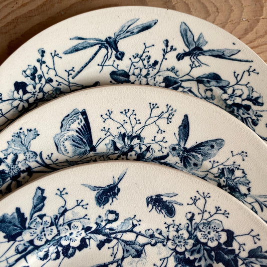 Antique Butterflies & Bees Side/dessert Plates (Set of 3): French teal blue Transferware, c1890