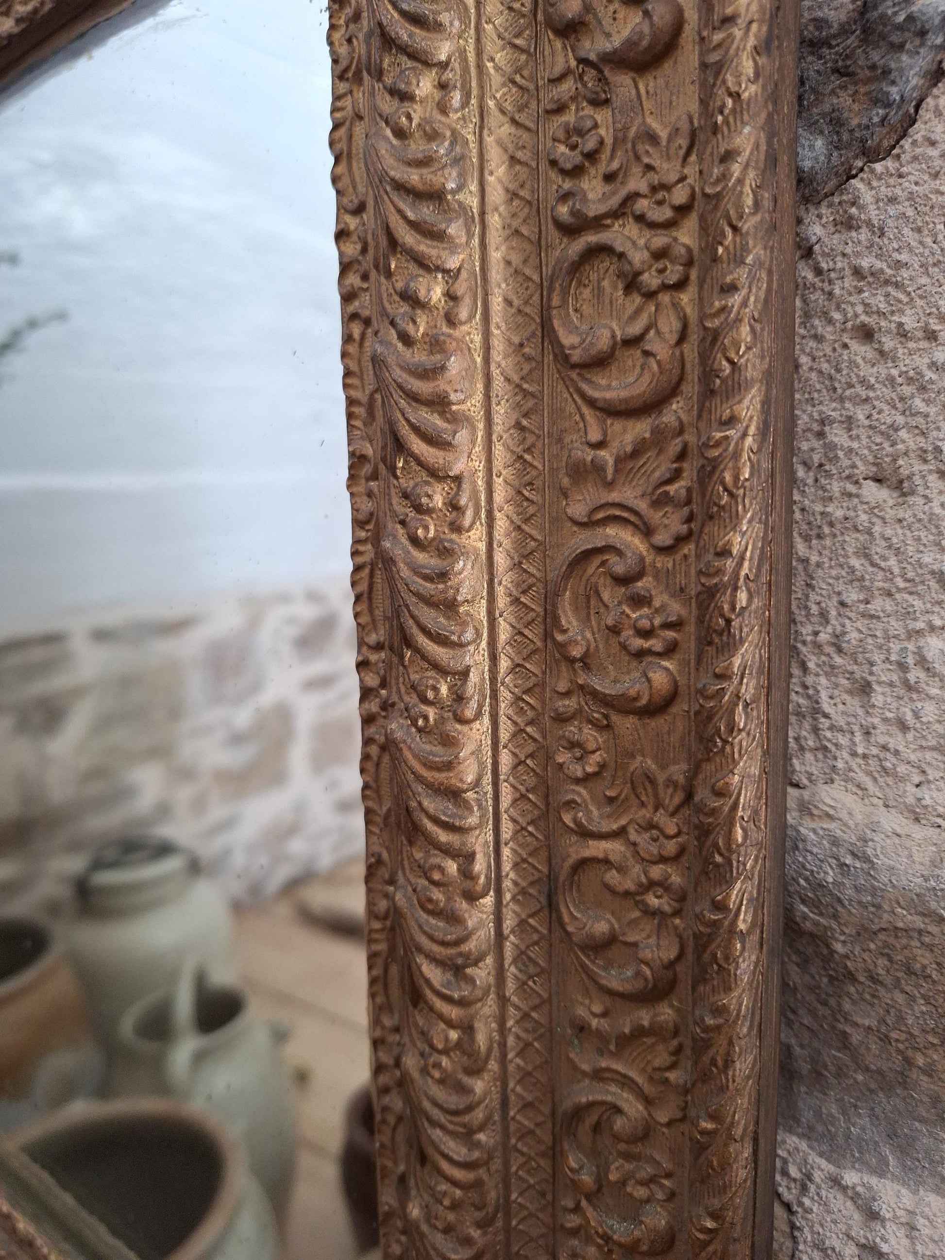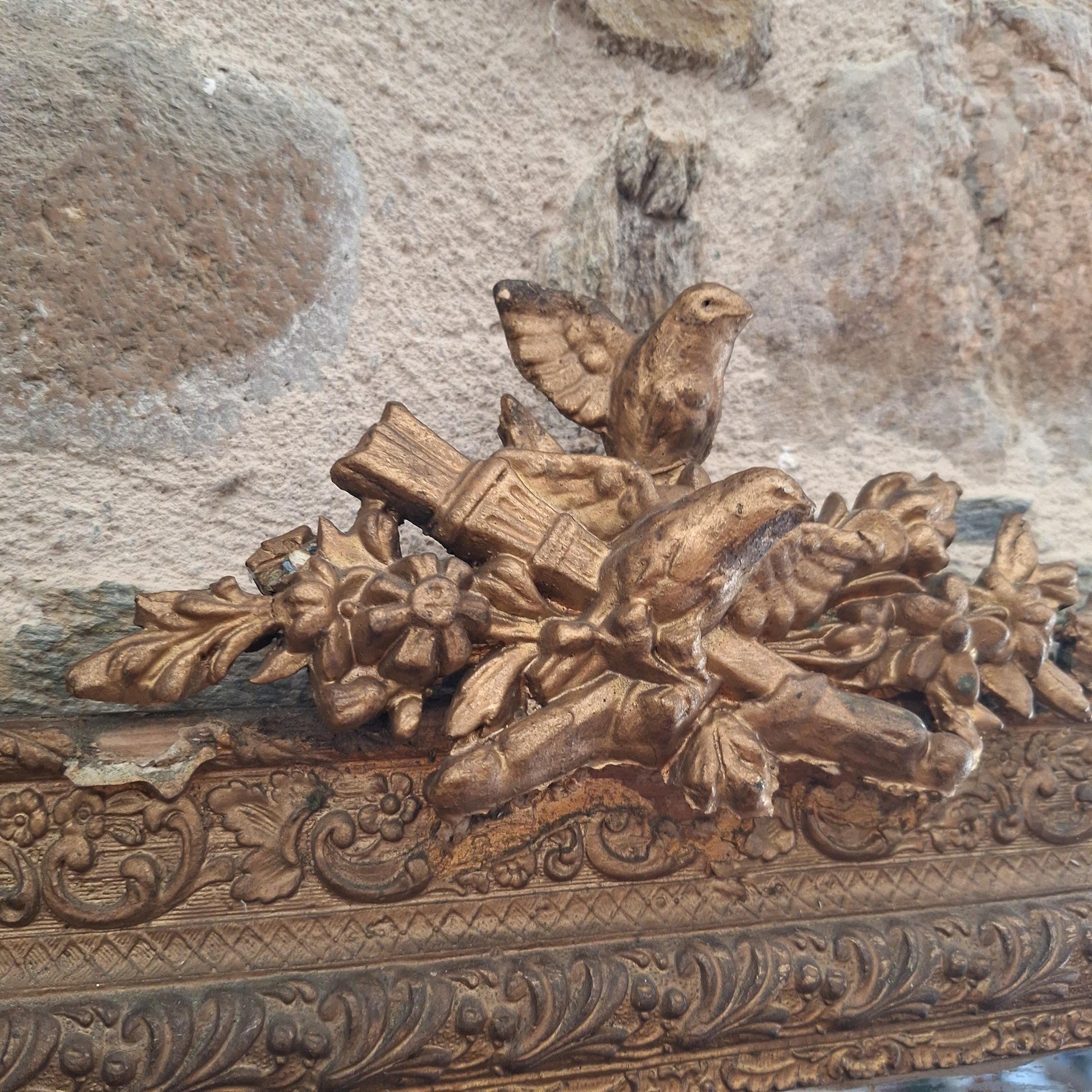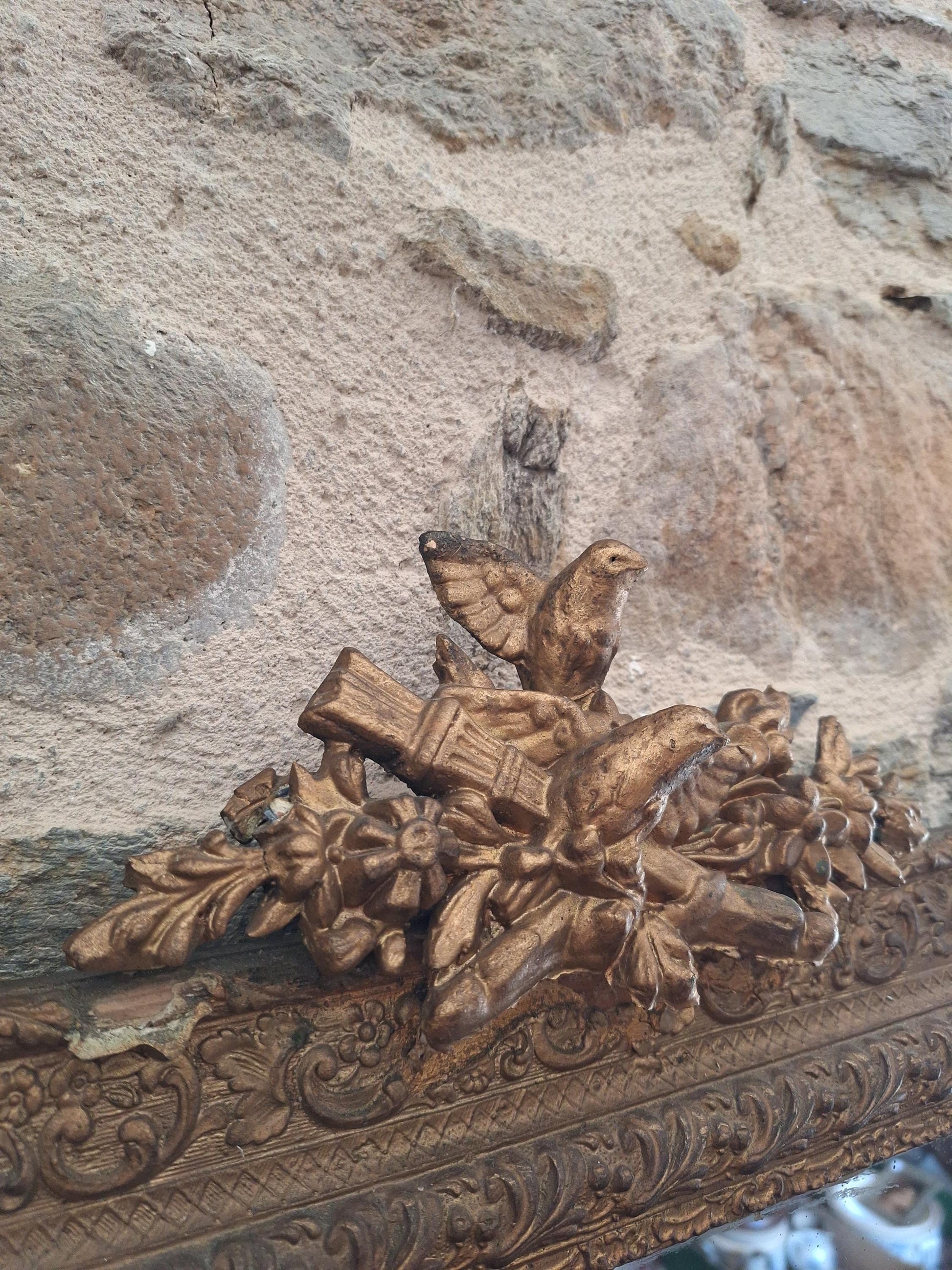A decorative antique rectangular mirror with an ornate wood and plaster frame featuring birds and floral moulding, dating to around 1900. A richly detailed piece with strong decorative presence.