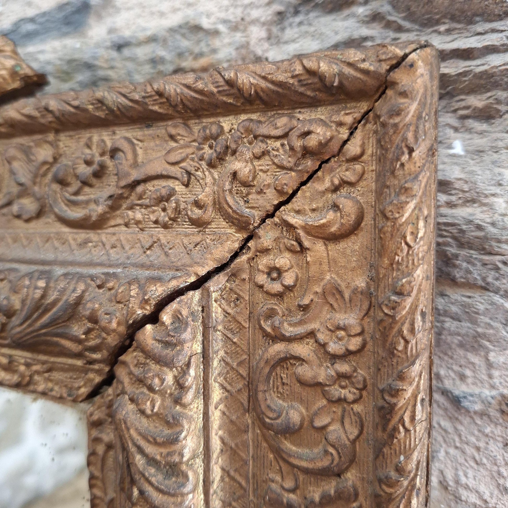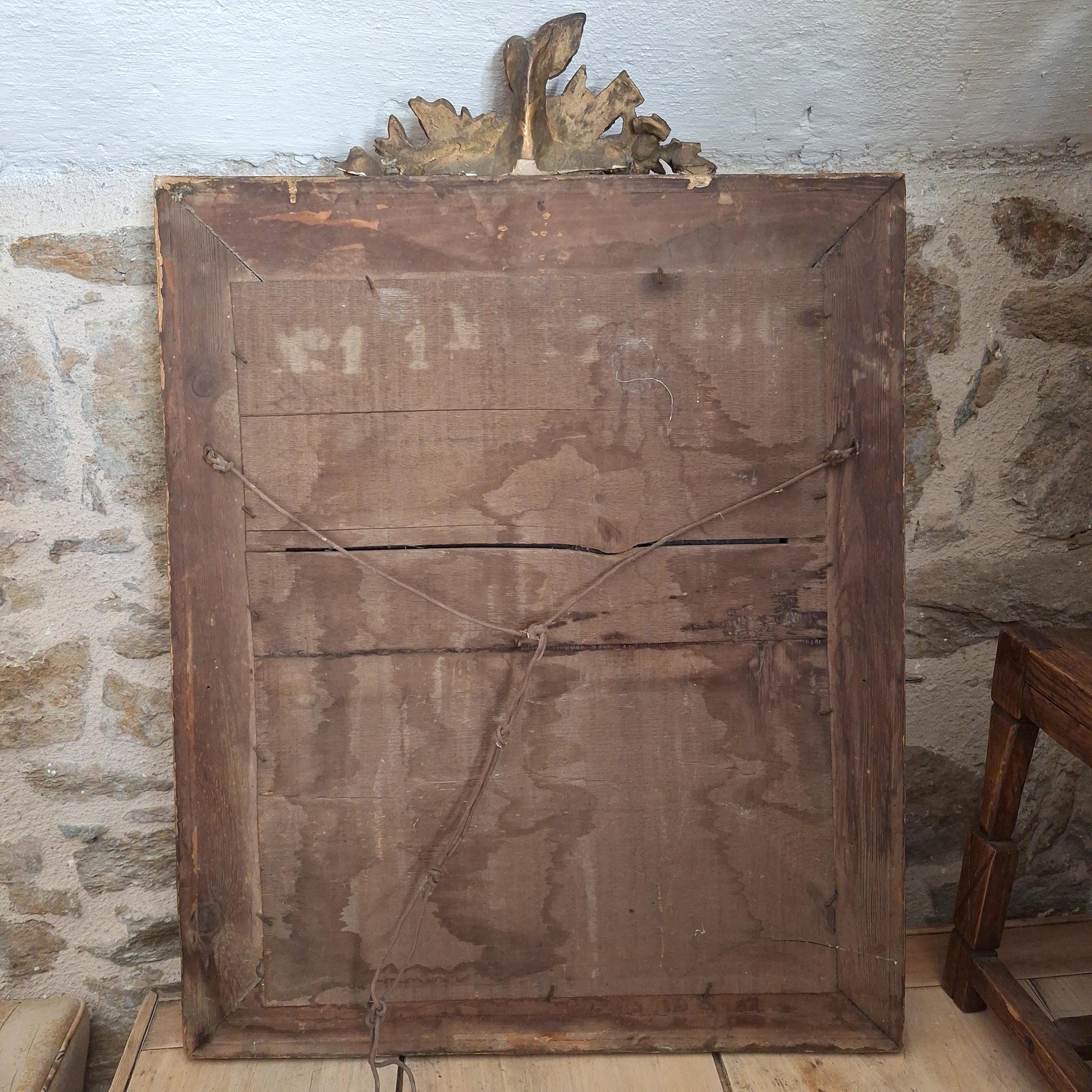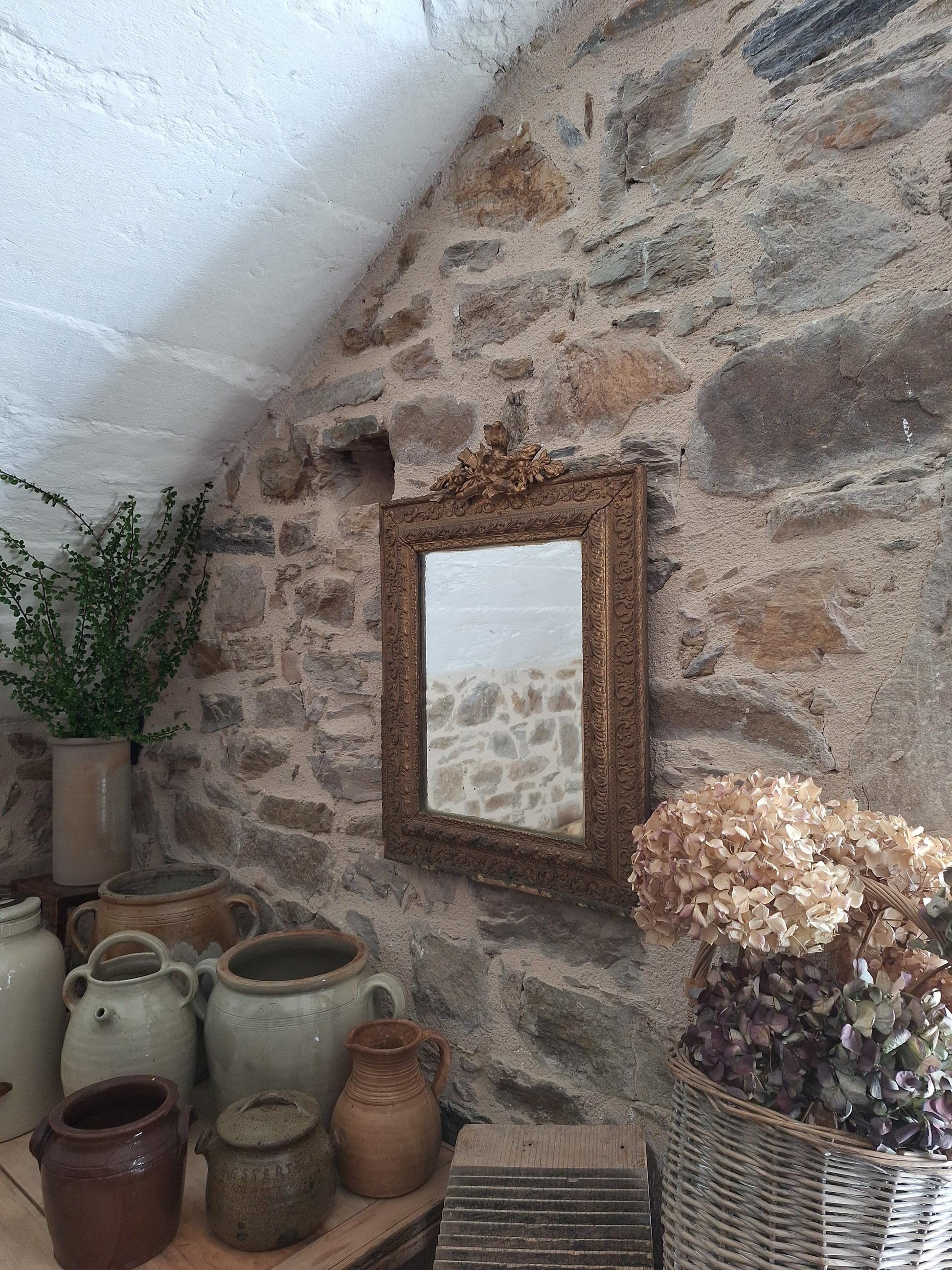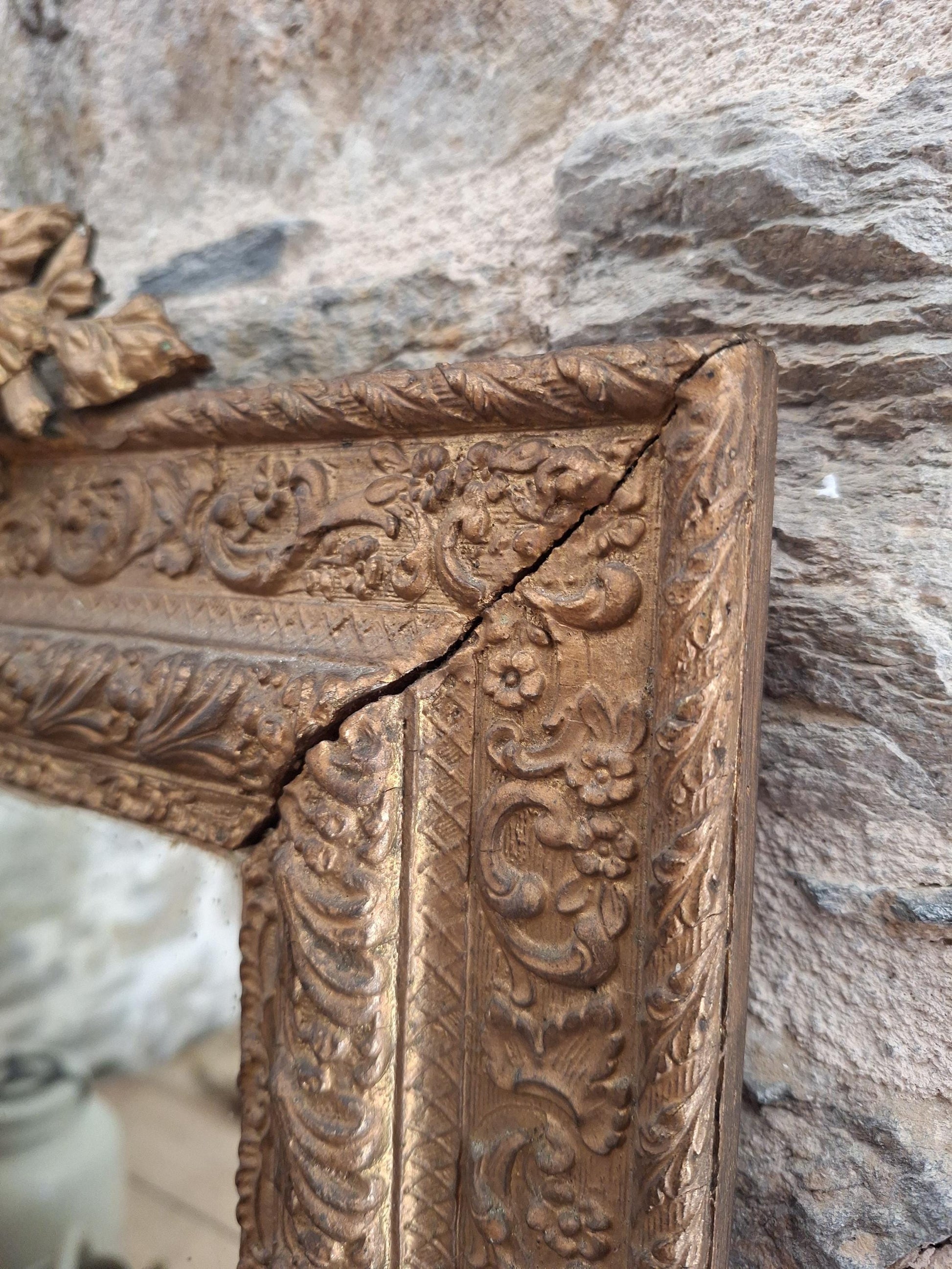 A decorative antique rectangular mirror with an ornate wood and plaster frame featuring birds and floral moulding, dating to around 1900. A richly detailed piece with strong decorative presence.