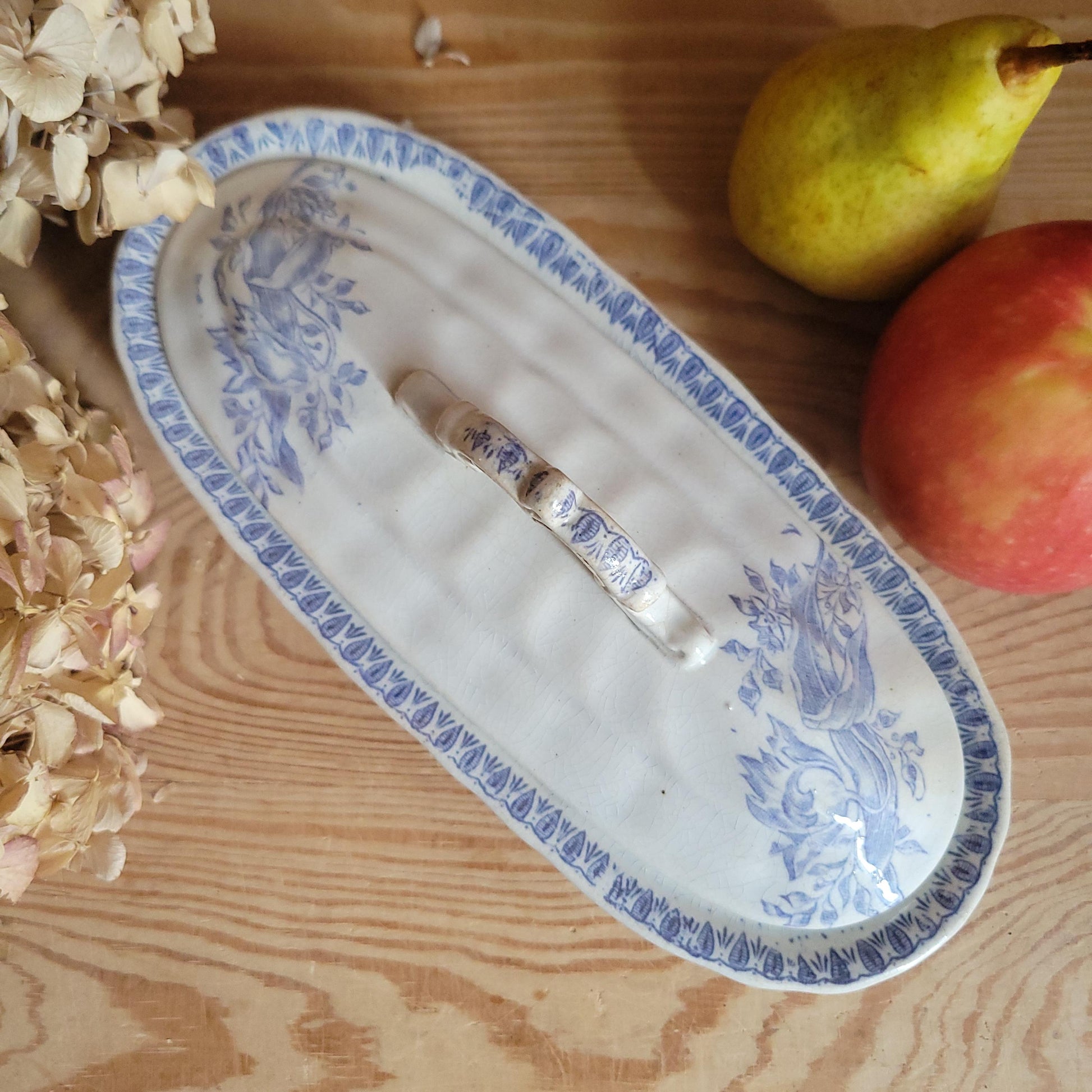 Antique Transferware Soap Dish with Lid, Lilac Blue Floral Design, France c.1890