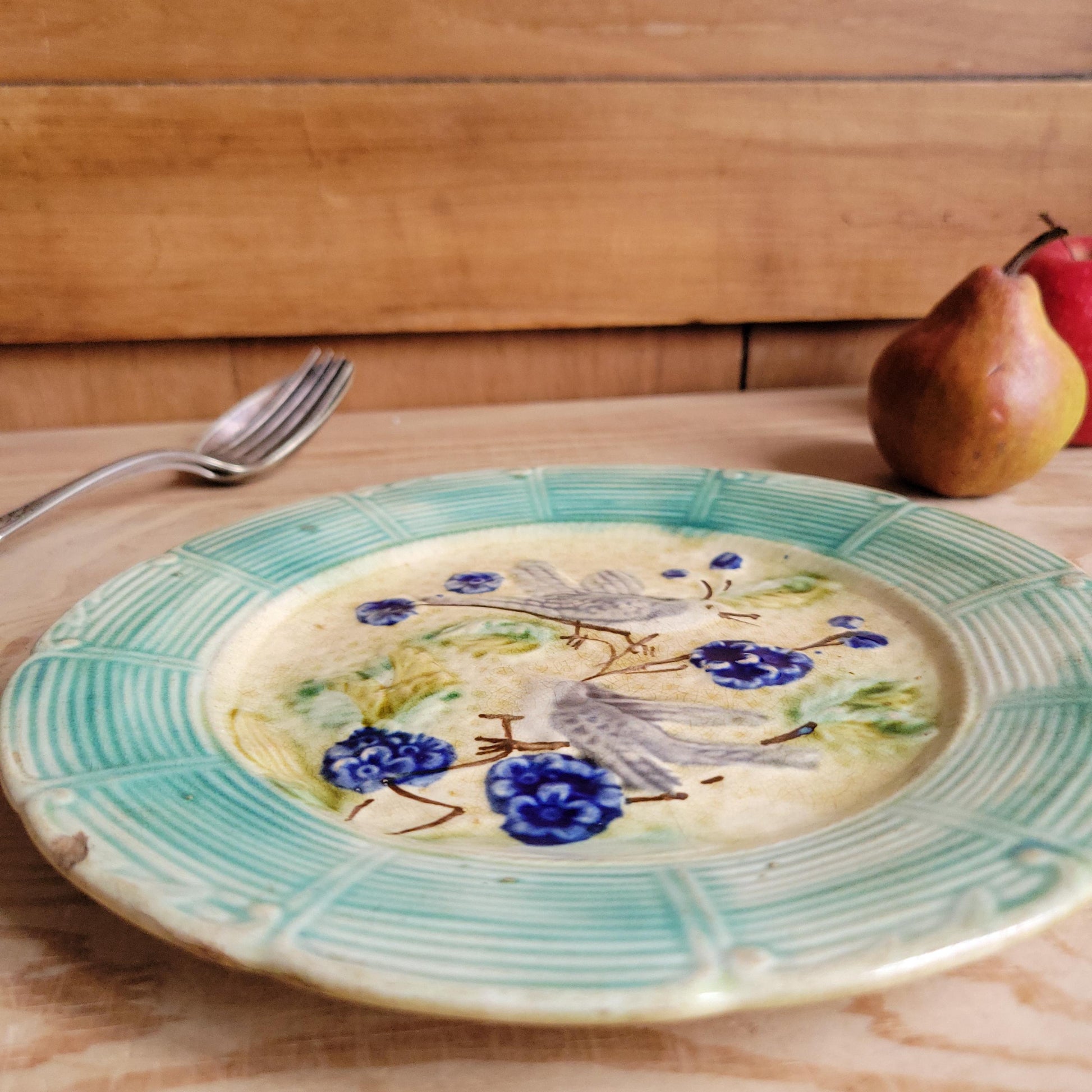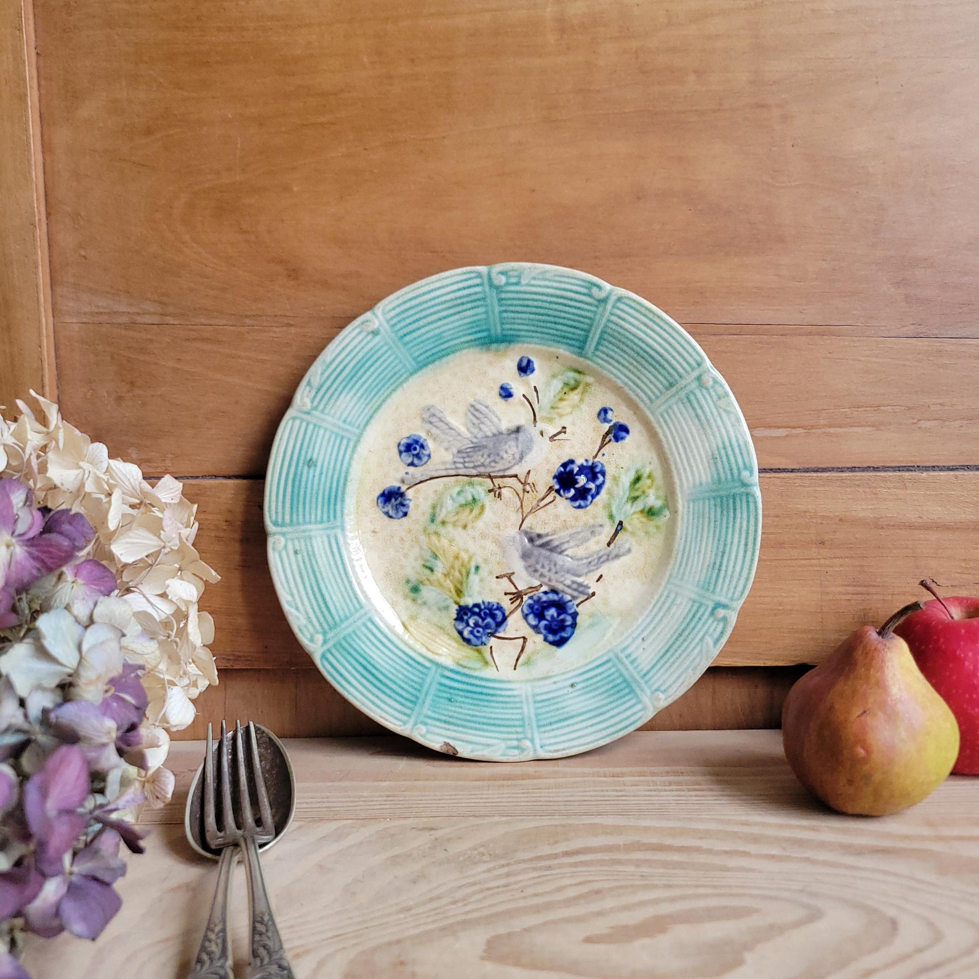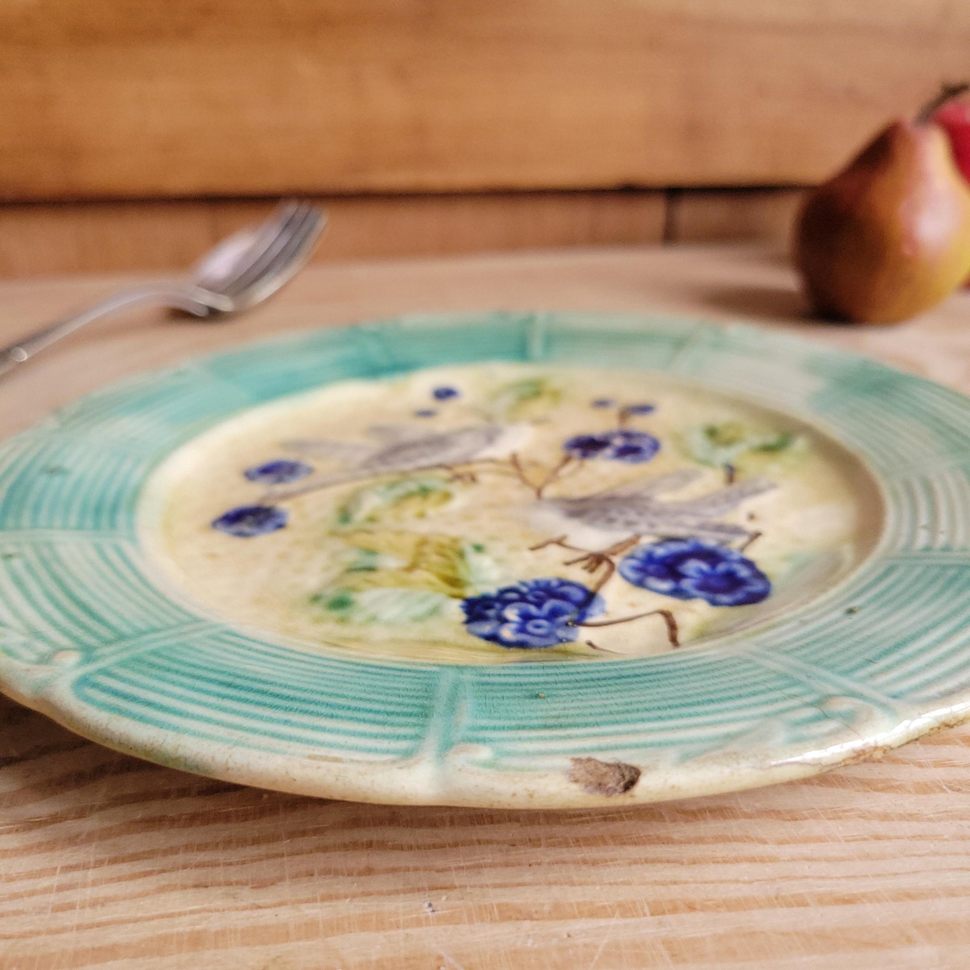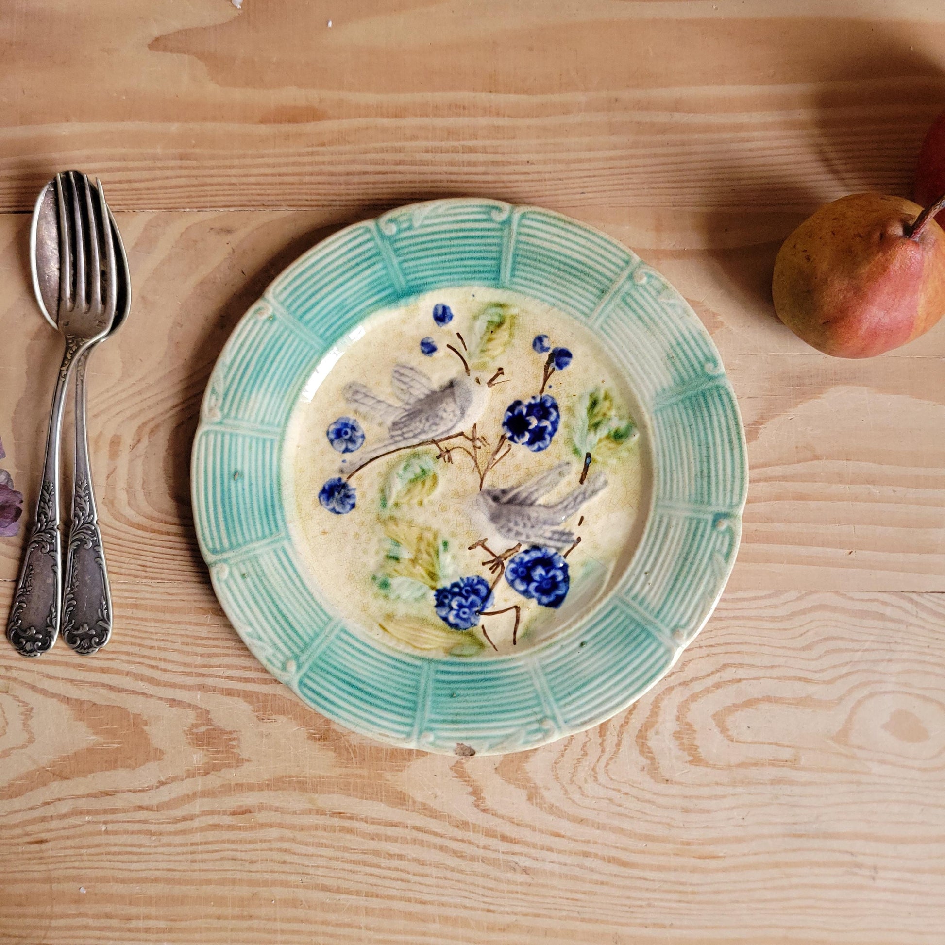 A French antique barbotine majolica plate, in a lovely design with grey birds on branches and blue flowers. Hand made in France c1890. A charming plate ideal for a collector of majolica, or for lovers of French faience.