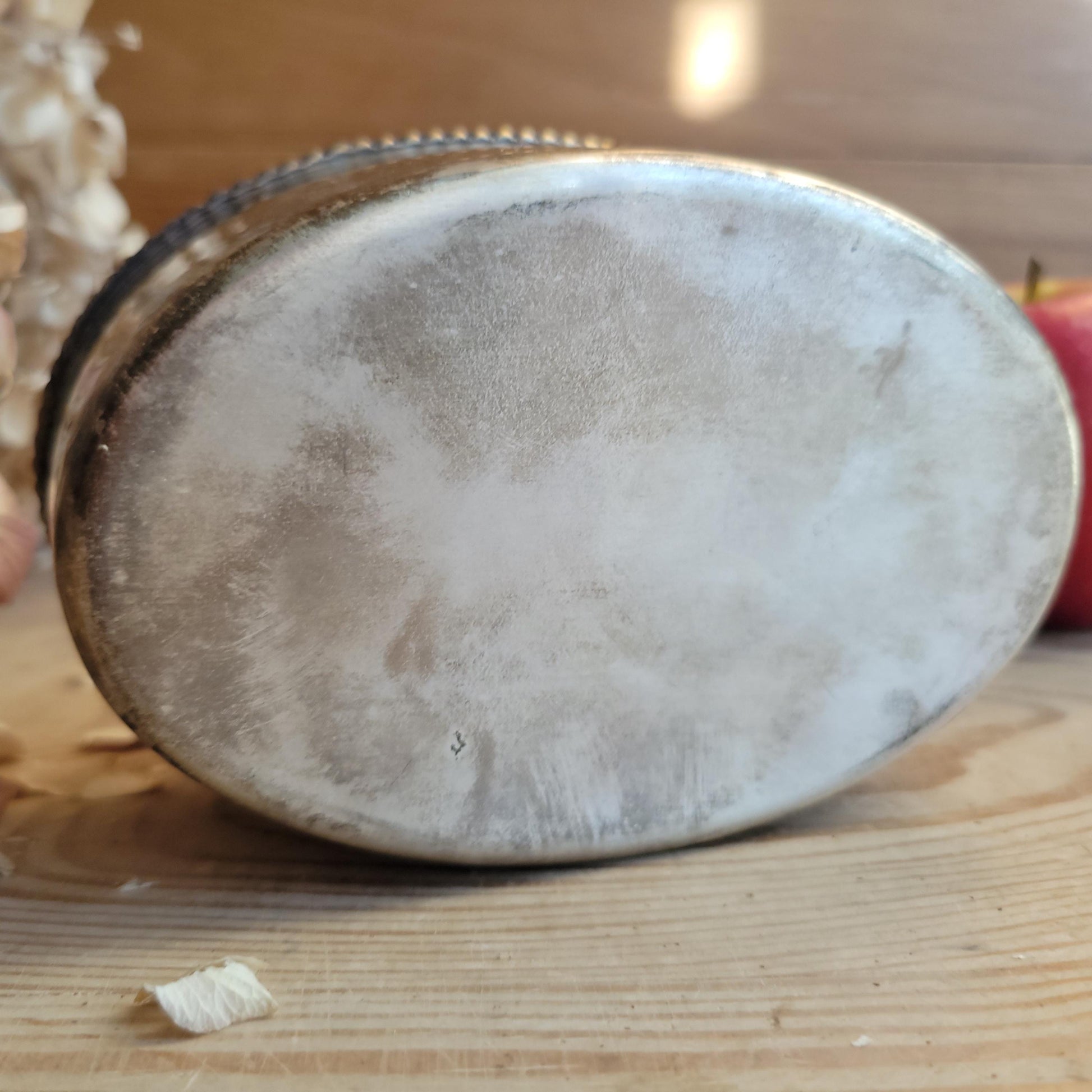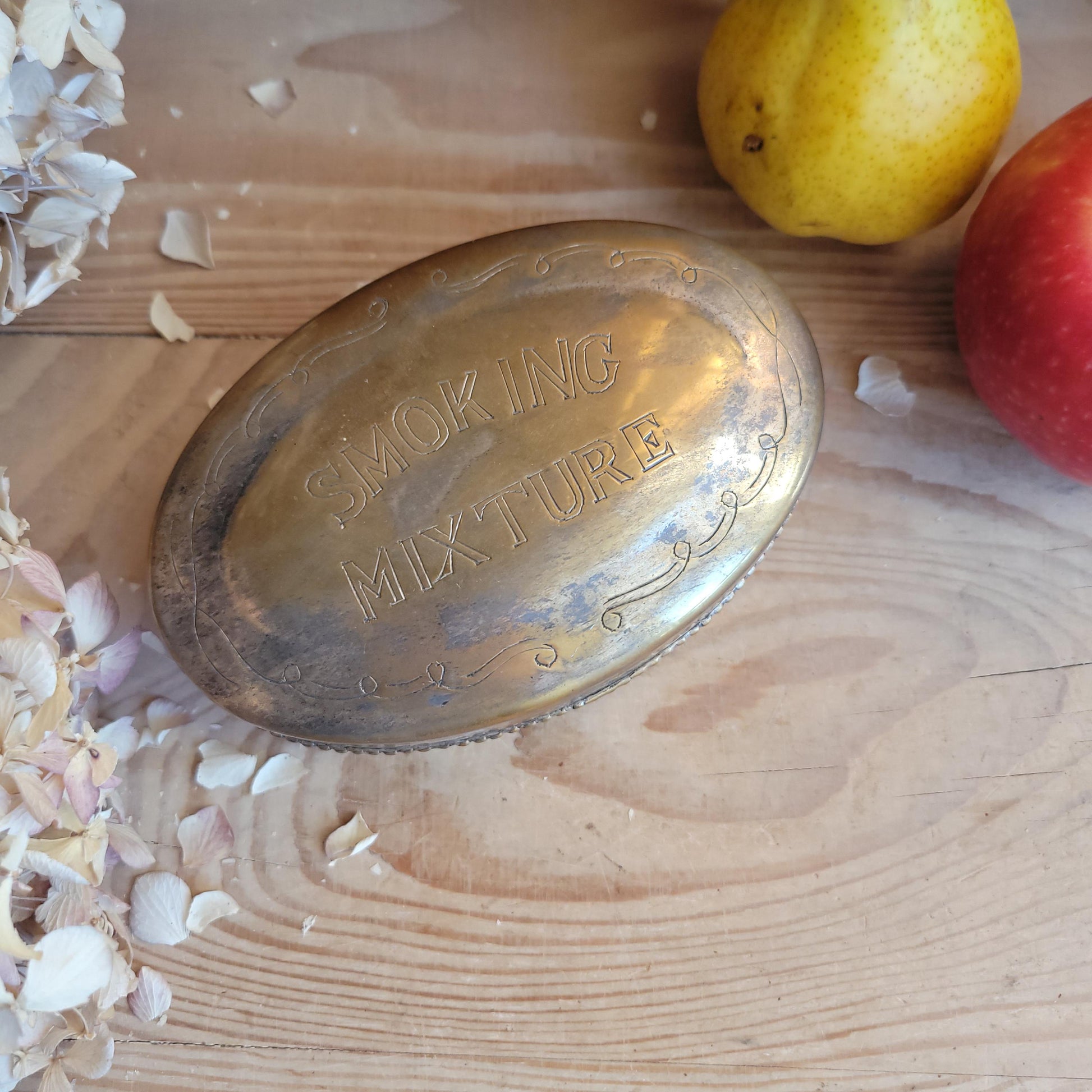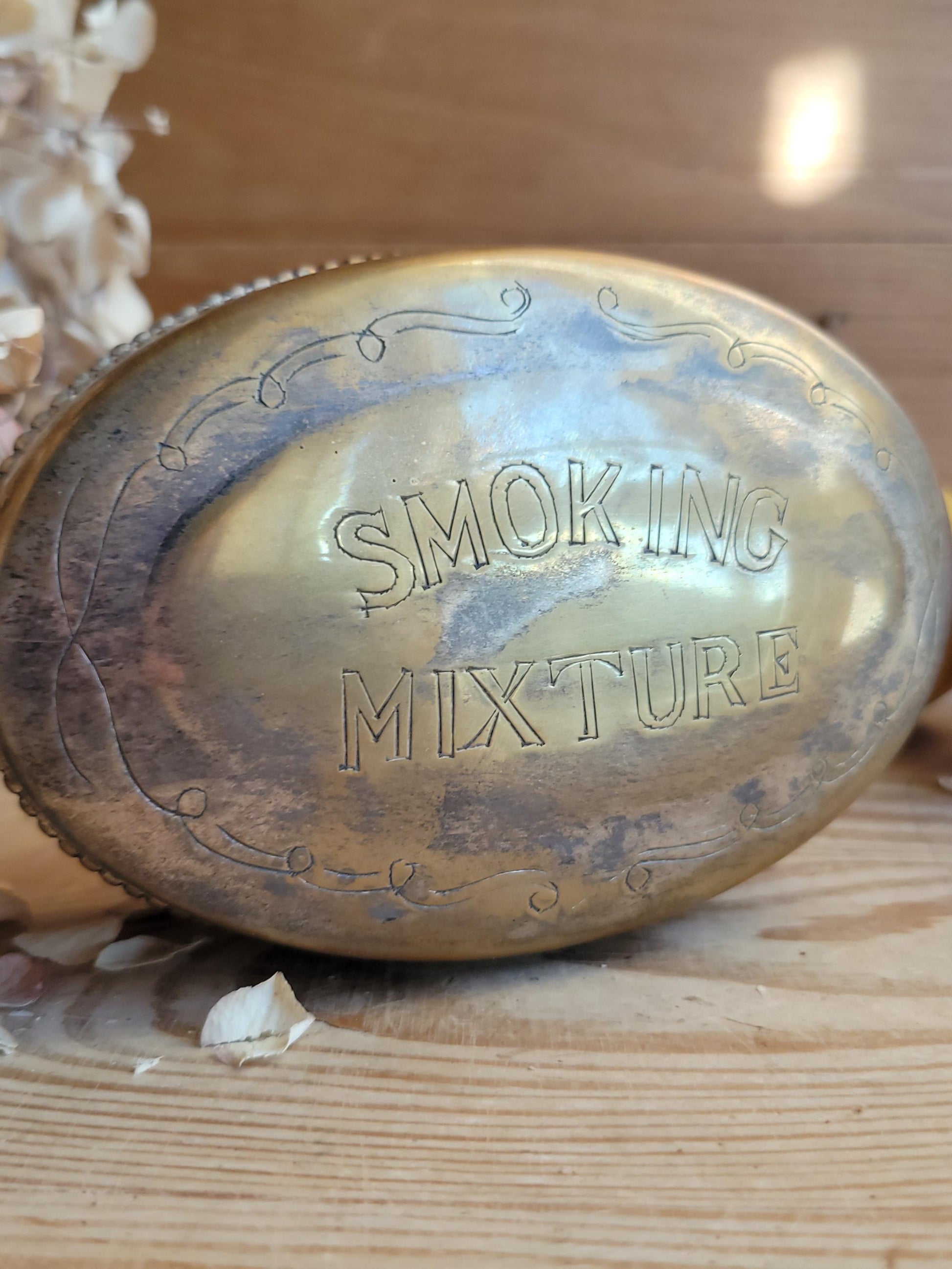 A compact antique silver plate box engraved "Smoking Mixture," originally intended for tobacco storage. Its clean oval form and aged silver finish make it both functional and decorative.