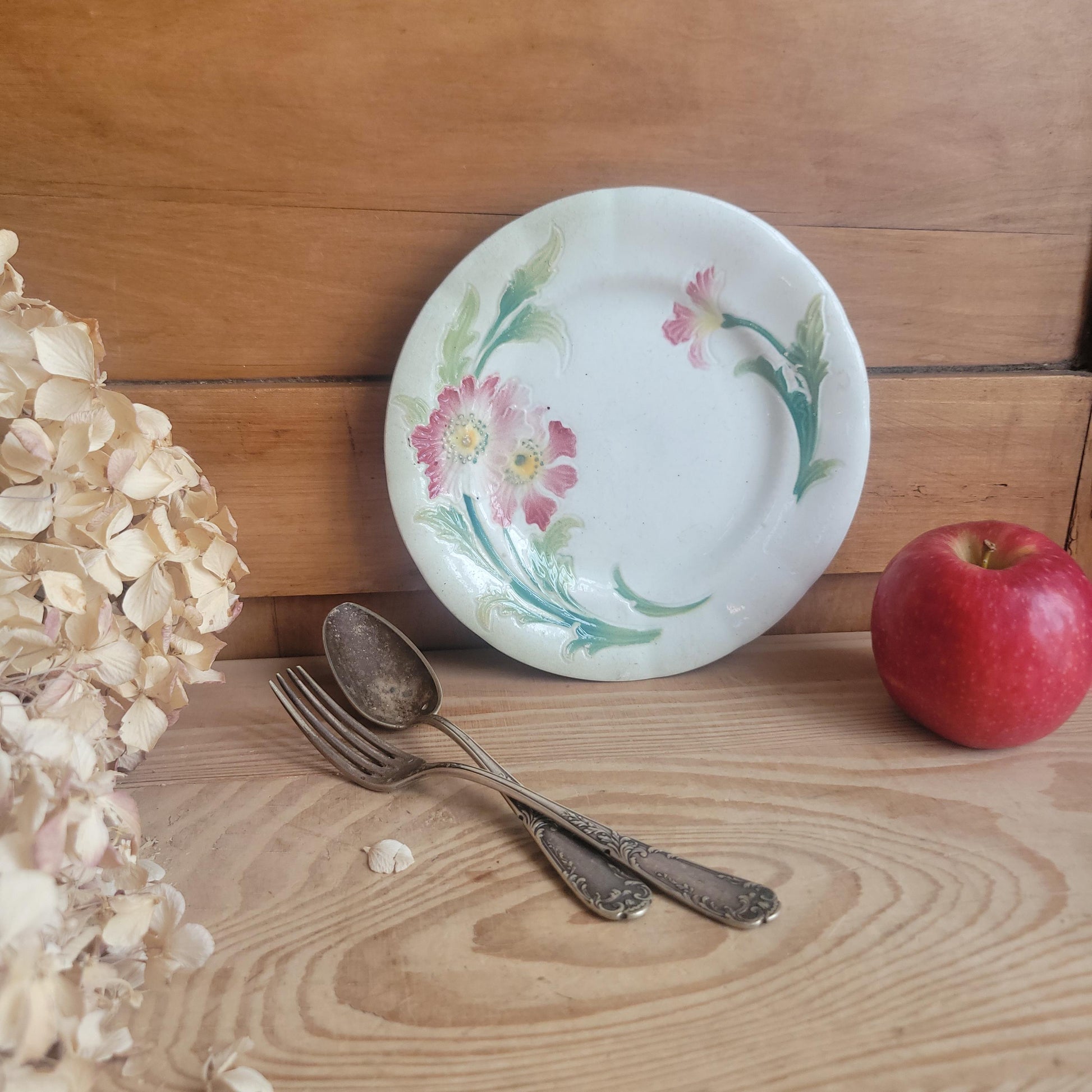 A small antique majolica side plate with pink floral decoration, likely hibiscus, in vibrant glazed earthenware. Majolica pieces are prized for their rich colour and tactile glaze.