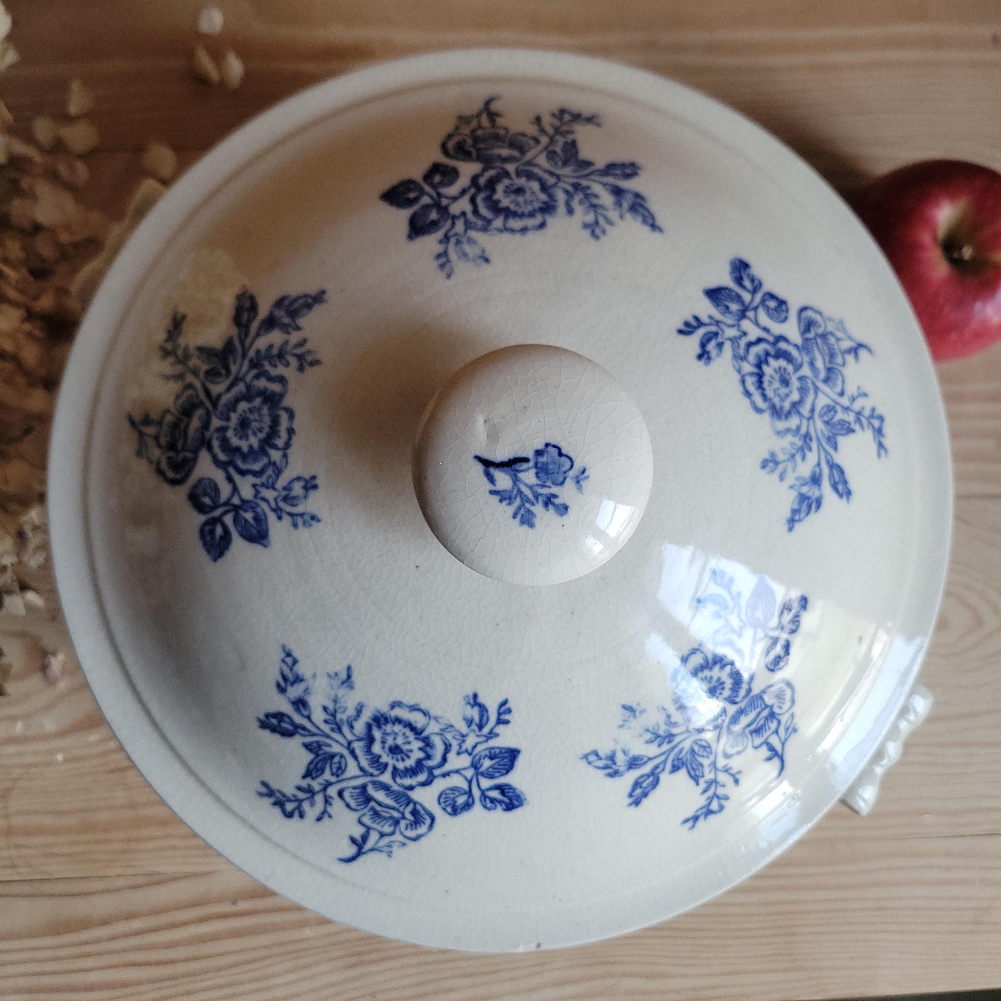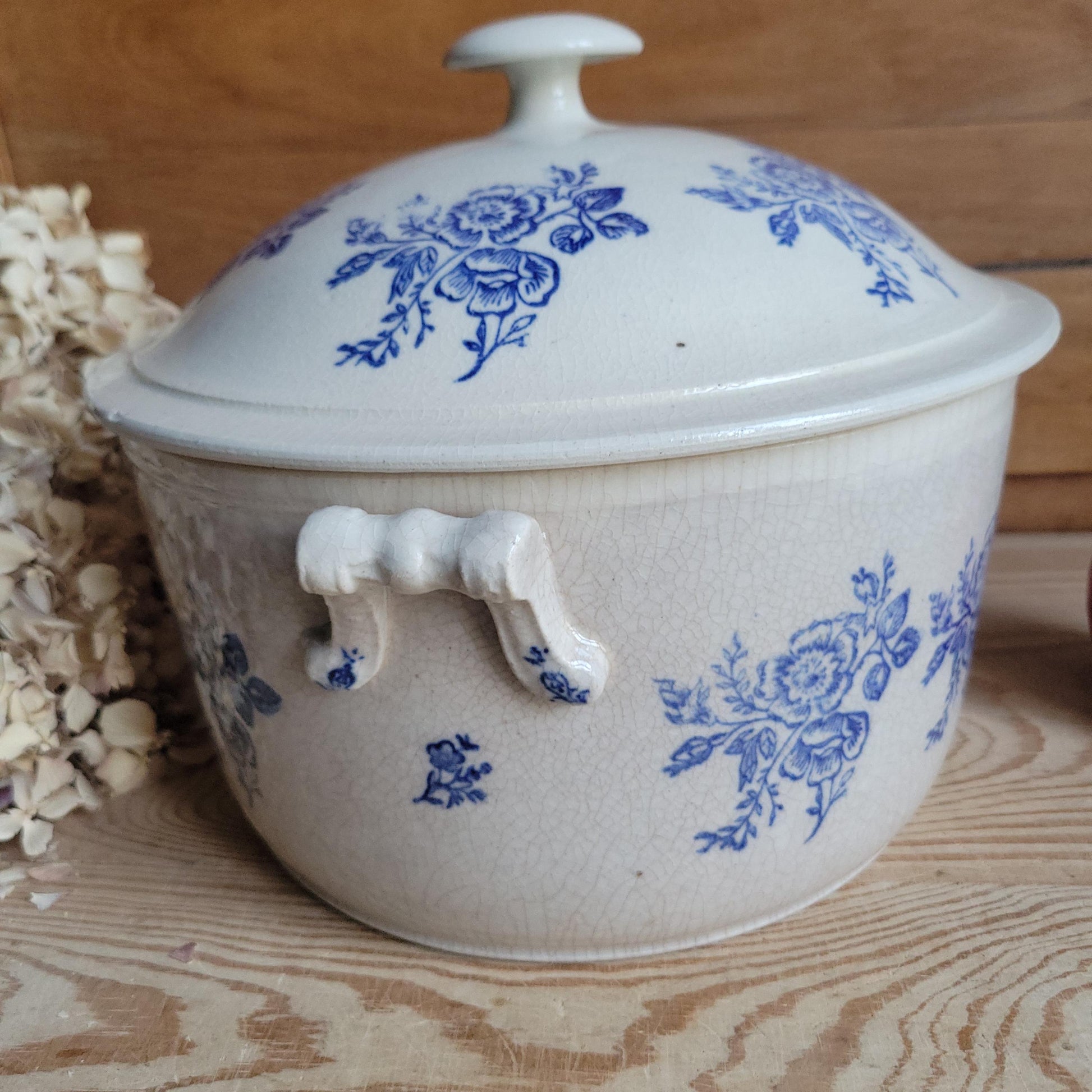 St Uze Stoneware Soupière with Lid, Blue Floral Decoration, France c.1920