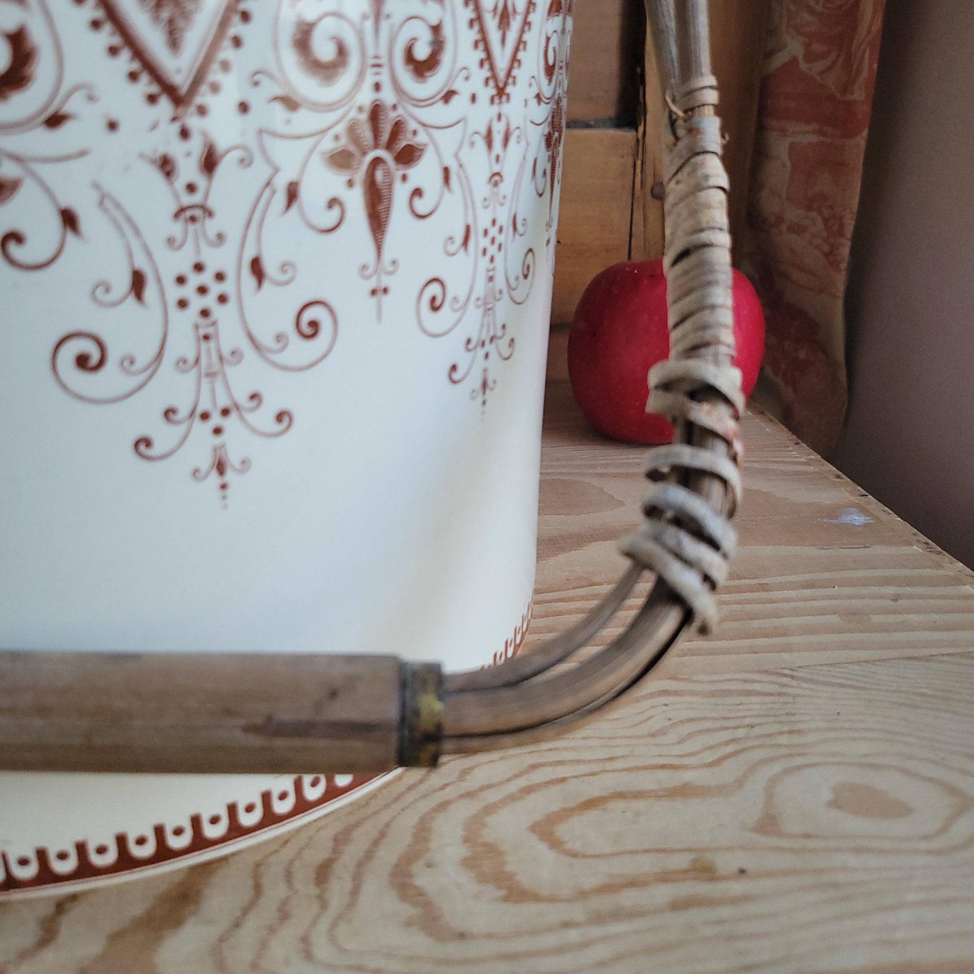 A striking and unusually large earthenware pot by Sarreguemines, fitted with a metal handle and wrapped wicker detail. Pieces of this scale are increasingly difficult to source, particularly in such clean condition, and reflect the robust utilitarian wares produced for both kitchen and storage use in late nineteenth-century France.